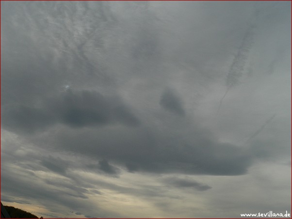 Man konnte heute  zum einen die schon bekannten sehr unnatürlich geformten Wolkengebilde beobachten, zum anderen etliche Chemtrailspuren, die unmittelbar über dieser Wolkenschicht ausgebracht wurden. Es war deutlich zu sehen, wie sich diese Chemtrails direkt mir den schon vorhandenen Wolkenfeldern vermischten, zum Teil in einer unglaublichen Geschwindigkeit. Die gesamte Wolkendecke verdichtete sich immer weiter, am Spätnachmittag gab es den ersten sehr kurzen Regenschauer, jetzt um Mitternacht hat es angefangen,