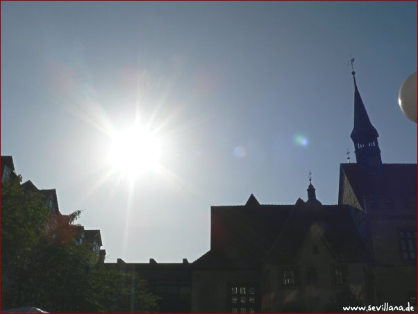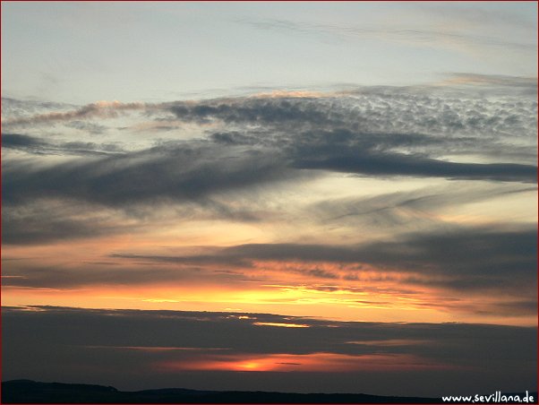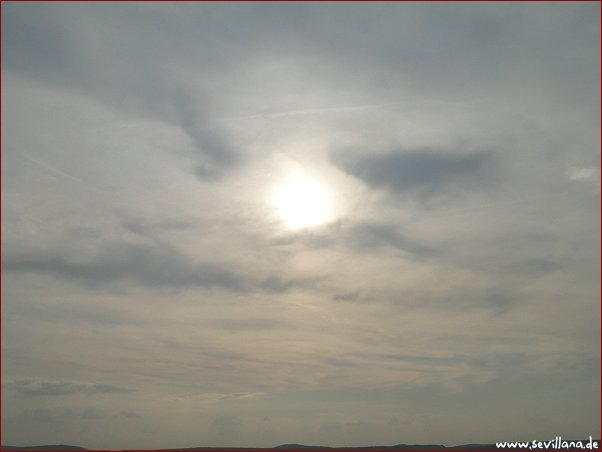 (Randbemerkung, bevor hier was fehlgedeutet wird: Auf dem letzten Bild ist oberhalb der Sonne ein senkrechter, etwas krummer Streifen zu sehen, der mir vorgestern schon einmal aufgefallen ist. Das sind offenbar Streiche meiner Kamera, eventuell abhängig vom Winkel, aus dem fotografiert wird. Jedenfalls ist das KEIN Fliegerstreifen, und auch sonst war da nichts am Himmel.)