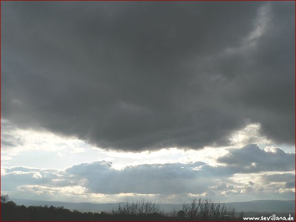 Am Nachmittag war besonders auffällig die intensiv dunkelgraue Färbung der Wolken um die Sonne herum, der Kontrast zu der ab und an dazwischen aufblitzenden gleißenden Sonne war so stark, dass es kaum fotografierbar war. Regenwolken waren das nicht, es fiel kein Tropfen. In der Wolkenchemie muss irgendwas enthalten sein, dass die Wolken so dunkel färbt, dass man - wenn man nicht bewusst hinschaut - schon vor der eigentlichen Sonnenuntergangszeit den Eindruck von Abend hat. Diesen Effekt hab ich schon öfter