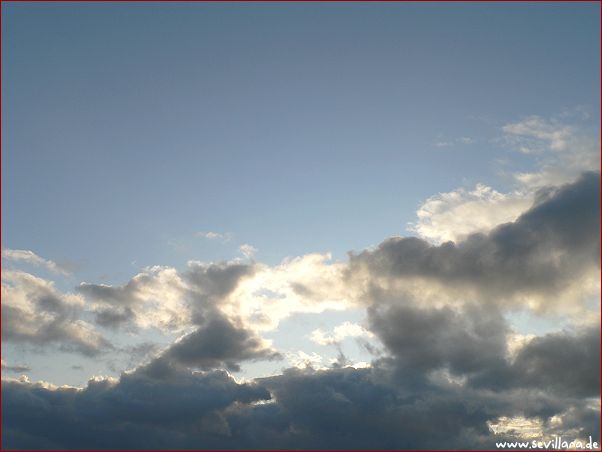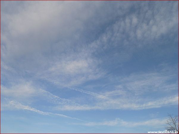 Der Vormittag war noch neblig-grau, dann lockerte sich der Himmel allmählich auf mit später richtig strahlender Sonne. Die Wolkenforman waren zum Teil abenteuerlich - typische HAARP-Kissen, kilometerlange Streifenbänke und Türme. Das letzte Bild zeigt am Nordhimmel das andere, richtige Blau.