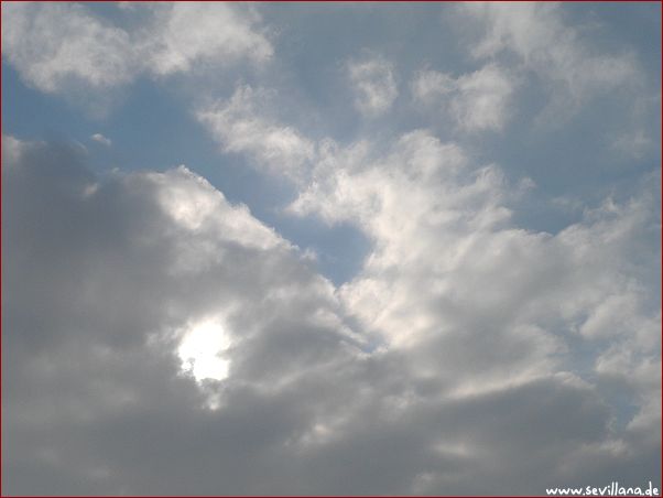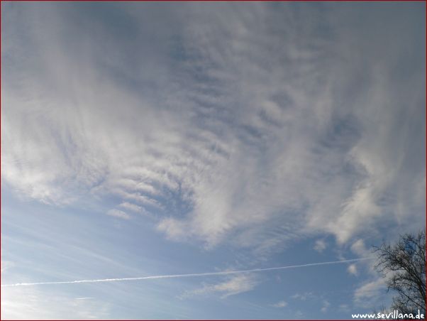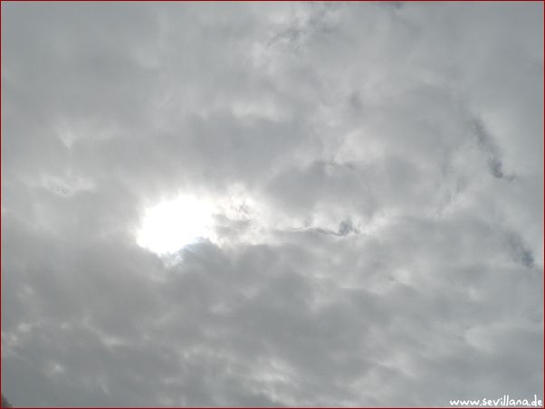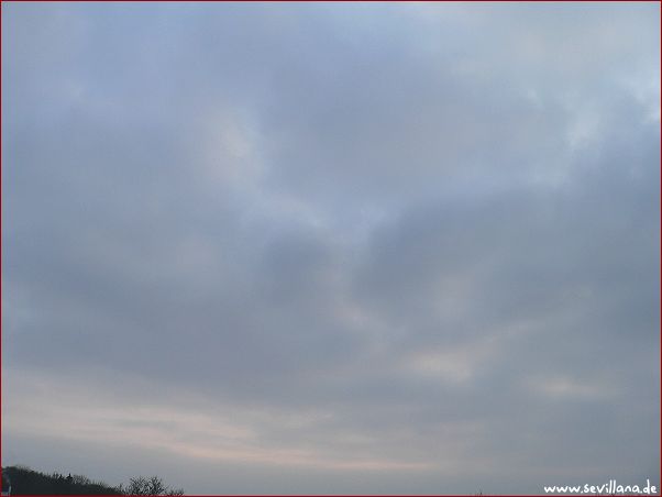 Nach einer relativ klaren Nacht mit einigen sichtbaren Sternen blieb der Tag keineswegs klar, obwohl der Himmel alle Voraussetzungen hatte. Es wurden wieder reichlich Chemtrails geflogen und Wolken erzeugt - beobachtbar für jeden, der hinguckt - die die Sonne zudeckten. Zuerst waren es Schleier, dann HAARP-geformte Gebilde, und schließlich war die dunkelgraue Decke vor der Sonne fertig - der übliche Ablauf der Sonnenverdeckung. Gegen 16:30 h kam die Sonne noch einmal kurz heraus, aber da wartete schon die