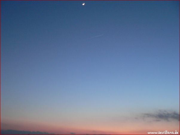 Wolkenbank im Westen für den Untergang (Sonnenuntergangszeit aktuell ist hier 17:30 h). Jetzt (kurz vor 23 Uhr) ist der Himmel sehr klar, vor ein paar Stunden war die dünne Mondsichel messerscharf zu sehen.