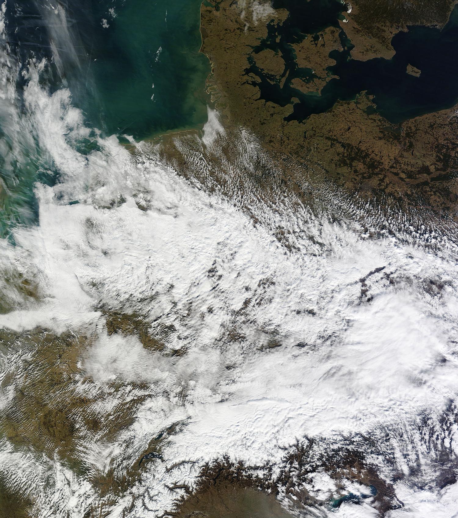 Wolken zuständig waren. -- Das heutige Bild vom Terra-Satelliten zeigt das Geschehen über D von oben, mit besonders deutlichen Sprühspuren über der Nordsee und deutlichen HAARP-Rippen im Südwesten.