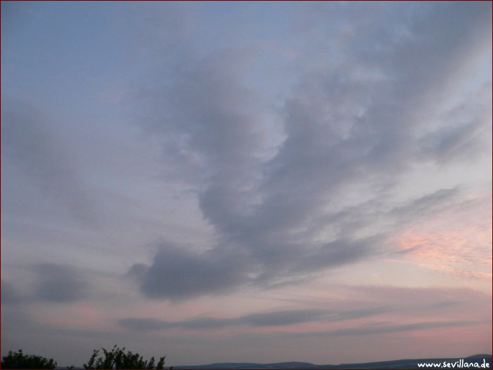 Seltsame Wolkenfärbung gegen 6 Uhr morgens. Der einzige Chemtrail-Flieger, den ich heute gesehen habe, flog abends um 21:15h. Auch gestern gab es weit und breit nicht einen einzigen, nur Flugzeuge ohne Trails. Heute dämmerte mir, warum - die unsäglichen Vuvuzelas, die seit der letzten WM offenbar nicht gänzlich ausgestorben sind, und die vielen Menschen draußen erinnerten mich an die Fußball-EM. Ein Himmel voller Chemtrails macht ja keinen lügengerechten Eindruck, wenn so viele Menschen draußen