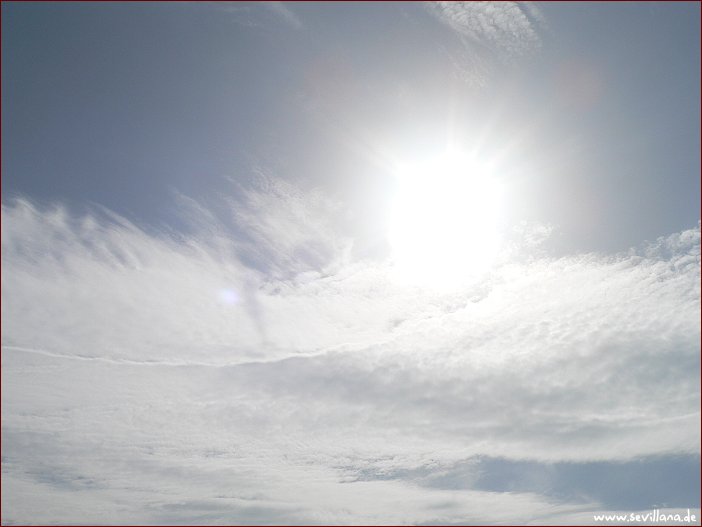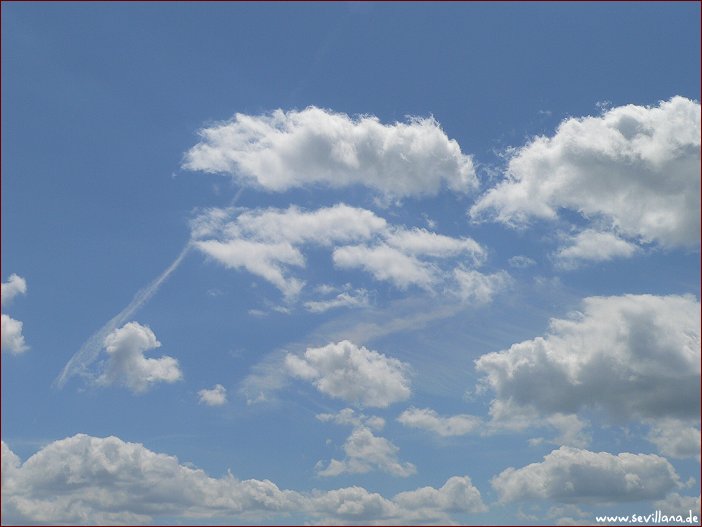 Wie so oft früh am Morgen klarer freier Himmel und über den Tag hinweg zunehmende Bedeckung mit Wolken aller künstlichen Spielarten. Ziemlich viel Wind, dadurch klare Luft, relativ viel Sonne und sommerliche Temperaturen, zwischen den Wolken sehr blau, was mit zunehmender Wettermanipulation immer seltener geworden ist.