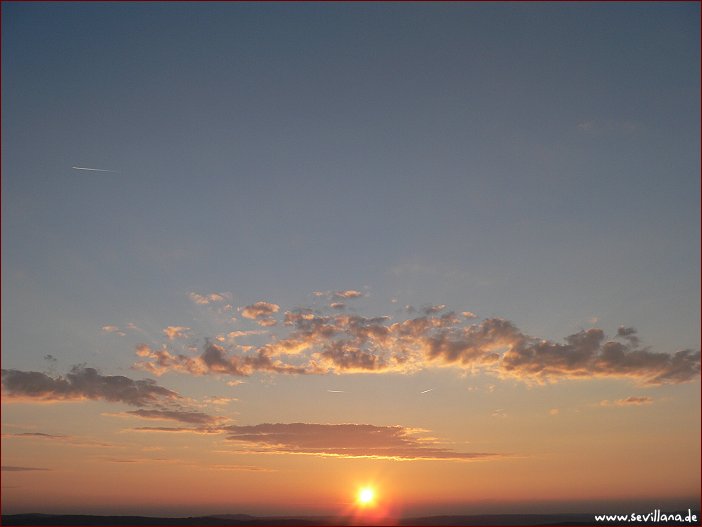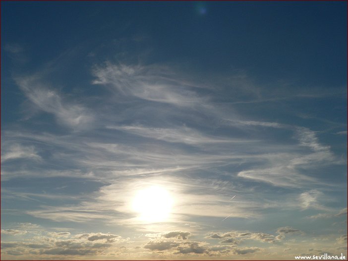 Heute mal wieder ein sehr schöner warmer Tag, Wolken-Sonne-Mix mit viel Sonne und sehr blauem Himmel, aber ganz ohne Schleier ging es im weiteren Tagesverlauf dann doch wieder nicht. Viele Chemtrails verschiedenster Art gab's, aber auch Flieger ohne irgendwelche Hinterlassenschaften, was immer auch bedeutet, dass die Flugzeuge mit Schweif tatsächlich Chemtrailer waren, die Schleier zeugen ebenfalls davon. Am Abend Verdichtung der Schleier im Westen rund um die Sonne und Sonnenuntergang hinter einer