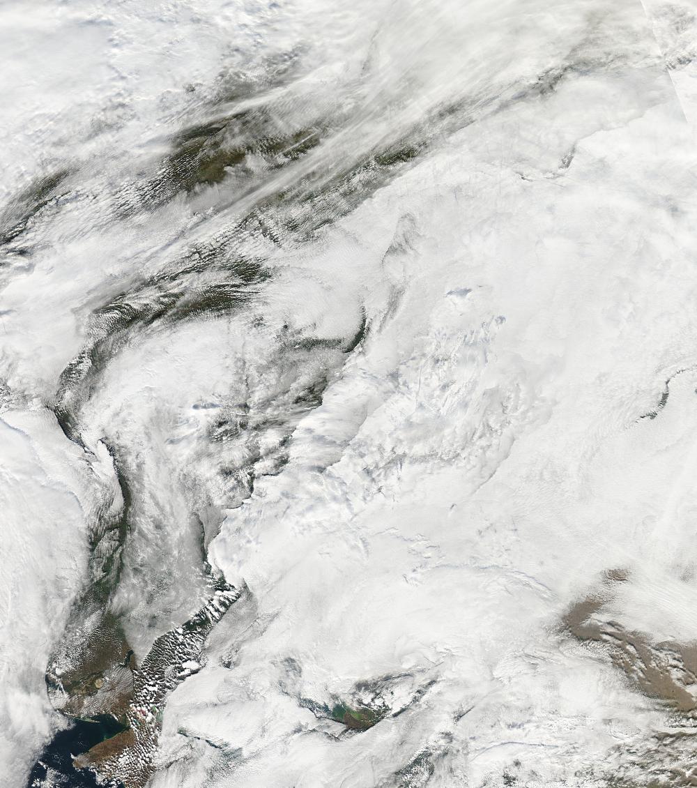 Das gesamte Sturm- bzw. Wettersystem hat sich weiter vergrößert und verdichtet - siehe Satellitenbild rechts. Es durchzieht den Nordatlantik von West bis Ost, d. h. bis Europa. Man beachte auch die Verbindung mit dem extrem langen Wolkenstreifen entlang der US-amerikanischen Ostküste. Die Wettermanipulation hat Ausmaße erreicht, die kaum vorstellbar sind und doch tatsächlich und wirklich existieren.