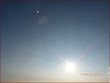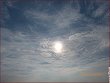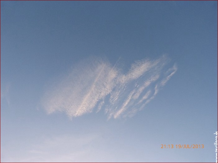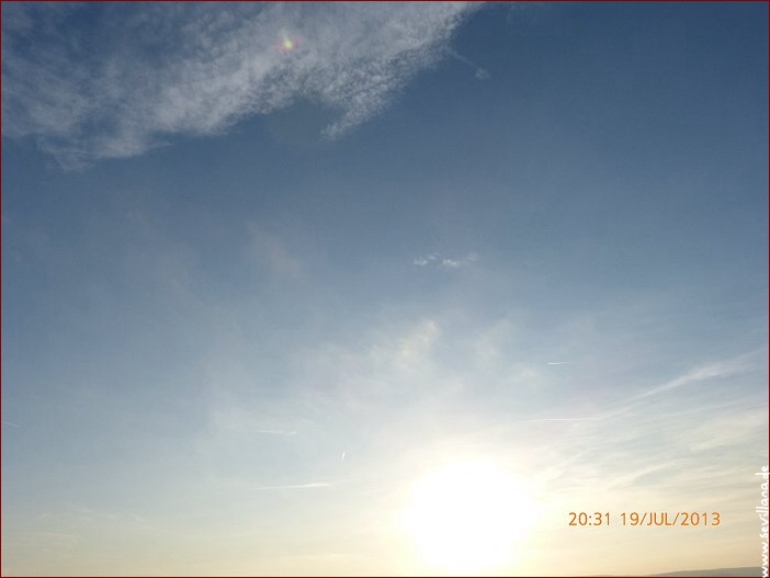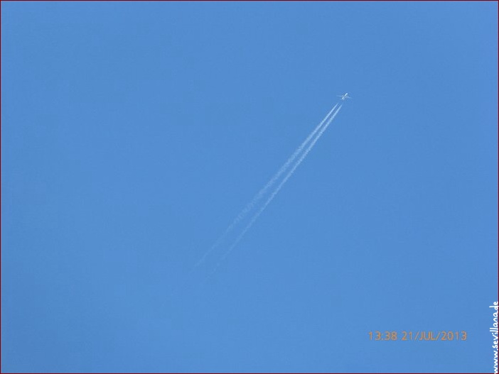 Am Sonntag, 21.7.2013, war der Himmel hier um einiges blauer als gewöhnlich, ganz ohne Wolken und mit eher unauffälligen Streifen. Die Flieger haben offensichtlich trotzdem etwas abgelassen (außer der immer wieder auffallenden hellblauen Farbe), denn es existierte trotz eitel Sonnenschein in Sonnennähe eine dünne weißliche Schleierschicht, die immer mal wieder für kurze Momente zu sehen war.