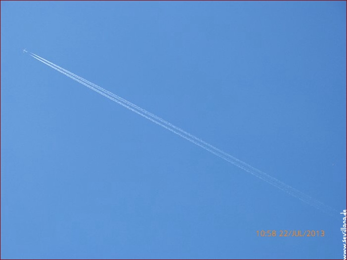Wenn man in den Zeitungen nachliest, wie das Wetter gerade ist, herrscht derzeit angeblich strahlend blauer Himmel bzw. strahlender Sonnenschein, was definitiv so nicht der Wirklichkeit entspricht. Der Himmel ist meistens blassblau bis weißlich, um die Sonne herum am stärksten. Es sind permanent mehr oder weniger auffällige Chemtrailer unterwegs, darunter sehr viele in ausgesprochen niedrigen Flughöhen, davon viele richtig laut. Dazwischen fliegen immer wieder und gleichzeitig Flugzeuge ohne Schweif. Derzeitig häufig zu beobachten sind abgerissene, unterbrochene Trails, d.h. der Flieger lässt nur ein kurzes Stück lang einen Streifen ab und fliegt ohne Streifen weiter. In den vergangenen Wochen haben sich viele so verhalten in jeweils ein- und derselben Region, am häufigsten im Umfeld der Sonne.